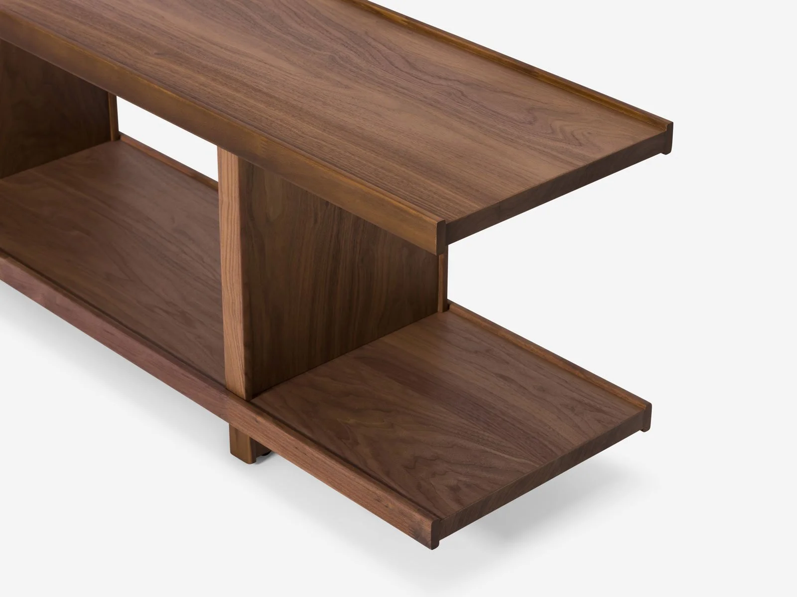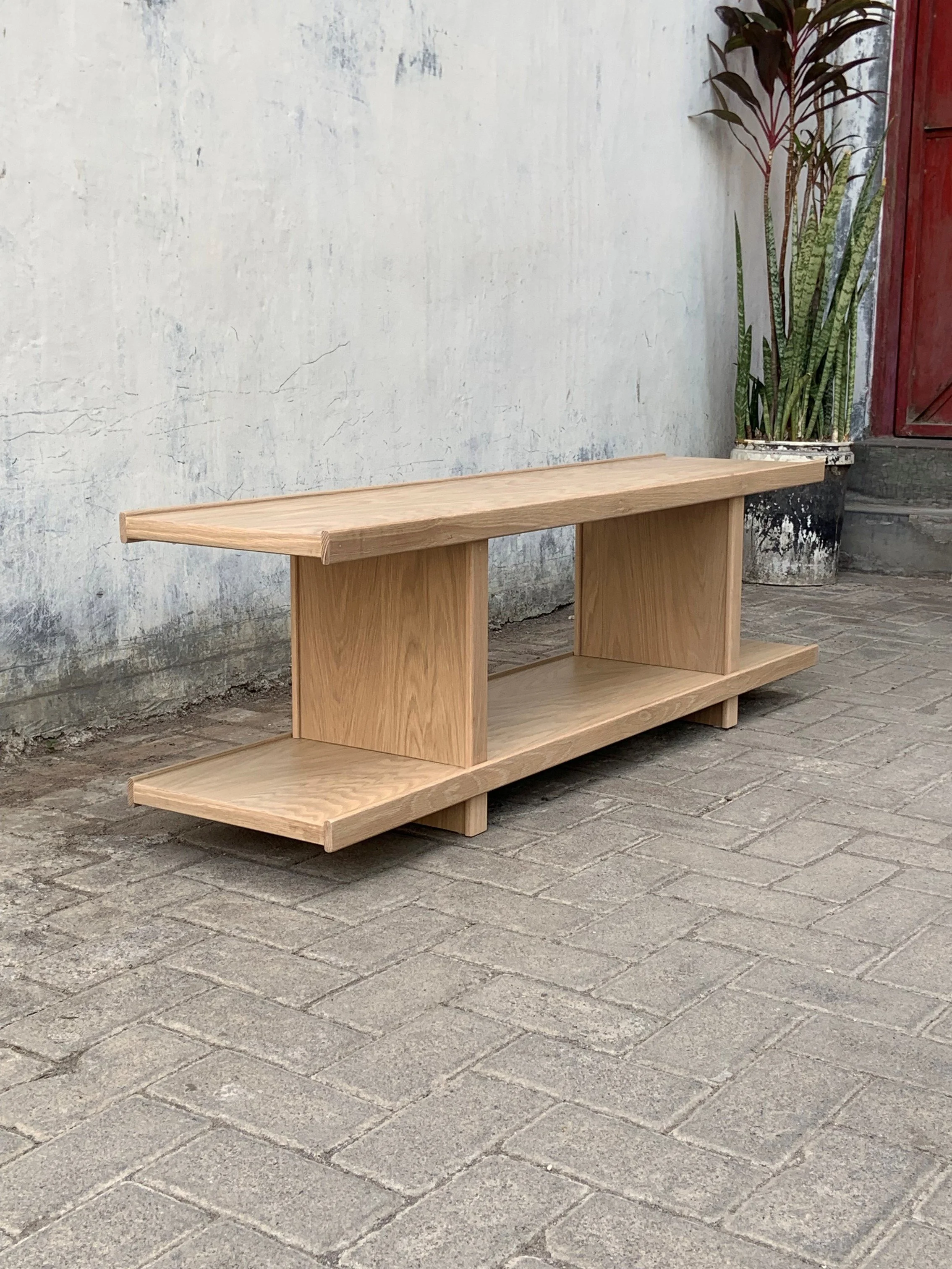 Pi is a modular shelving system that can be expanded both vertically and horizontally through interchangeable elements. A solid wood edge defines each component, serving both structural and visual purposes. Structurally, it creates rigid surfaces without the need for inset stabilizing elements. The projecting lip also functions as a subtle restraint, keeping objects securely in place. With its open back, books can rest against the edge and lean naturally against the vertical posts. Visually, Pi celebrates the materiality of solid wood, framing every surface with a continuous outline.