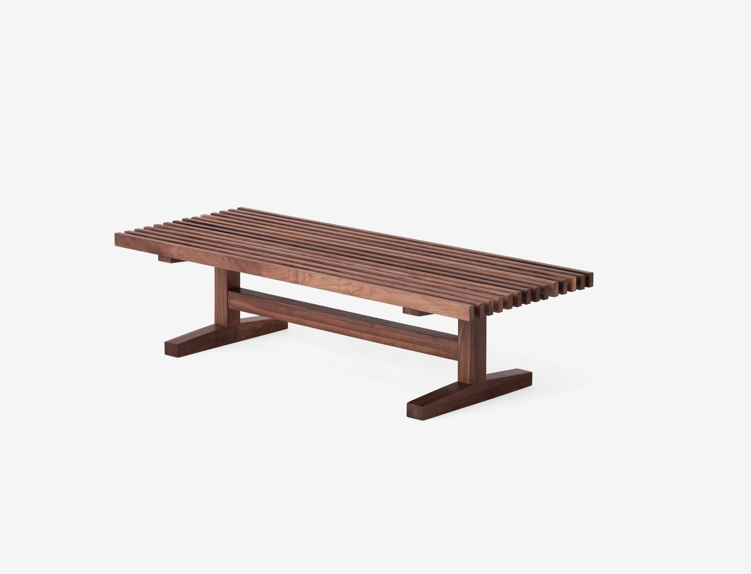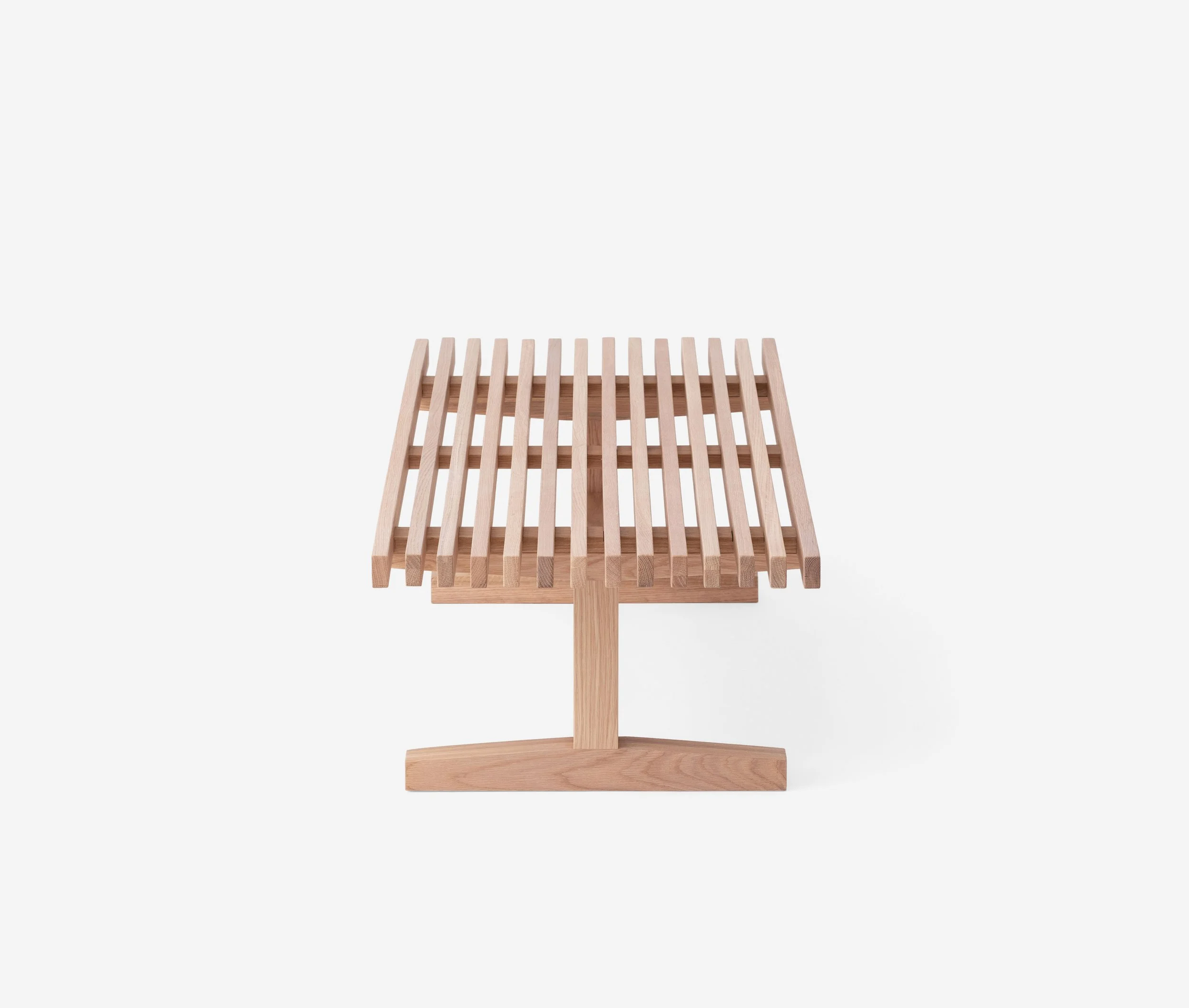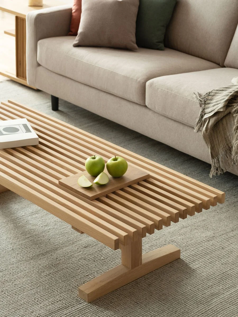 The Ban collection was designed in 2018. It is made of solid American white Oak and Walnut. The I beam structure with slatted tabletop has a strong architectural language. The surface is an interplay of solid wood and negative space. The textural richness is not only evident in composition but comes to life when exposed to natural light.