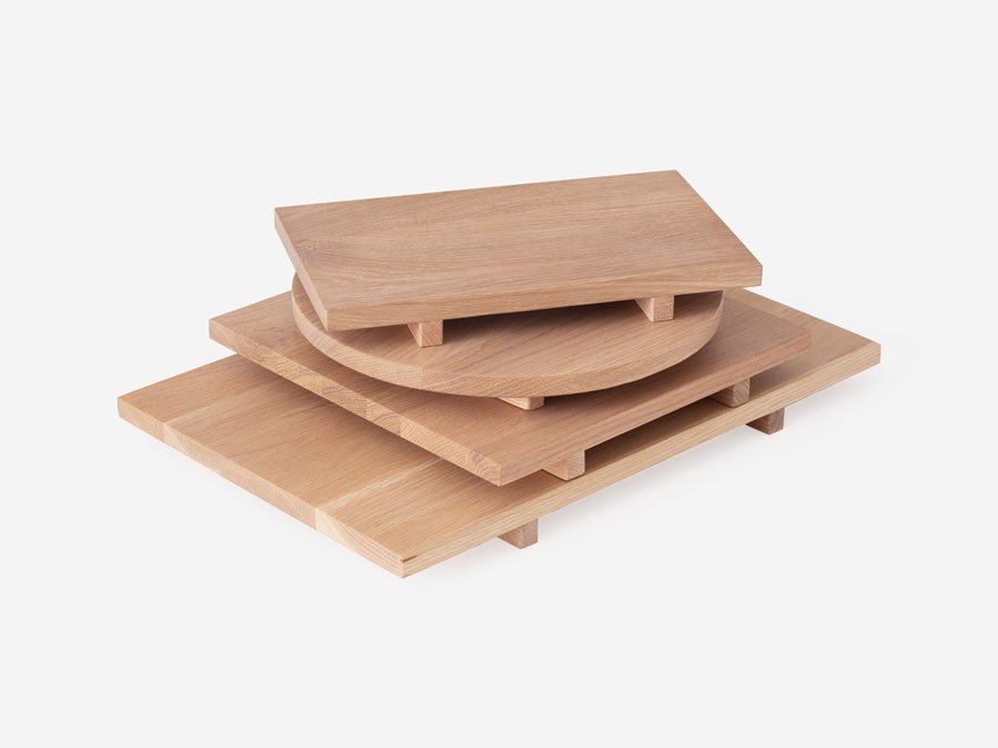 The negative space is dimensioned at 20 millimeters, allowing fingers to reach into the gaps to lift, arrange and place various wooden surfaces. The stretchers of the wood surfaces either slot into place, or when turned 90 degrees create an elevation effect.