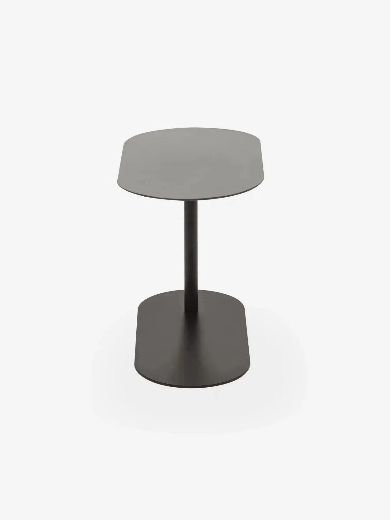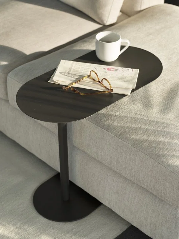 The base slides under sofas, allowing the surface to hover over a seating surface or sofa arm. The surface and base consist of sheet metal. An inset steel rod reinforces the top and doubles as a grip for moving Finn.