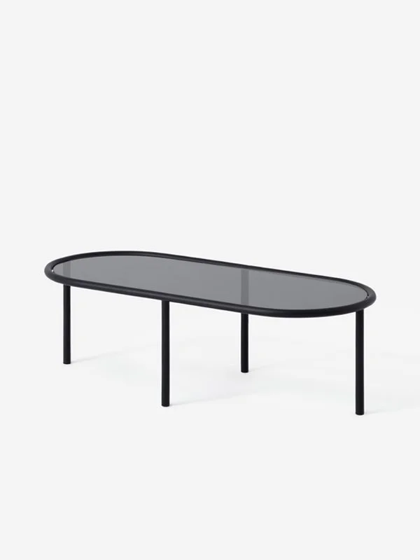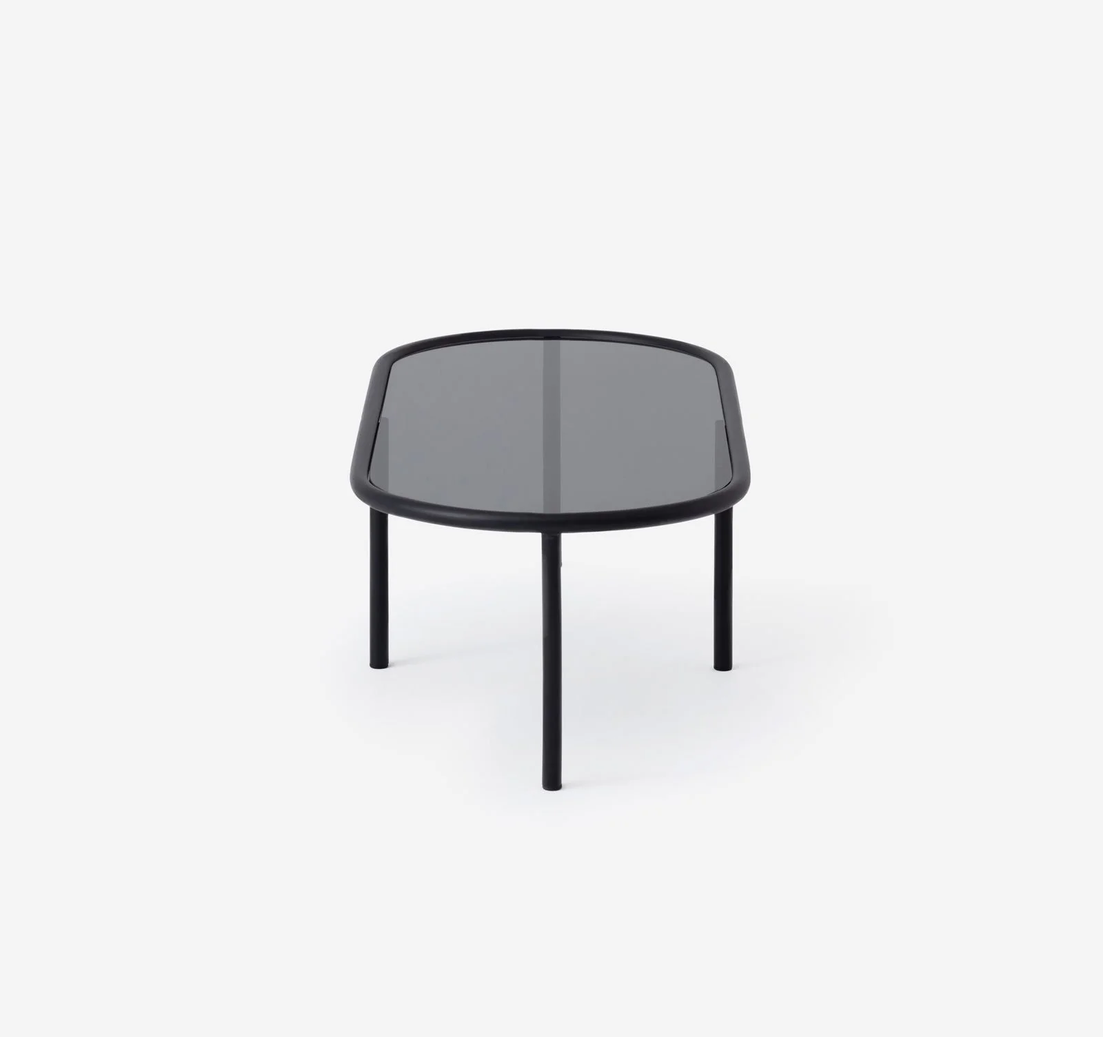 Tubular was designed in 2018. Made of steel metal tubing, bend to simple shapes. The post is inset by the measurement of its radius, allowing a quarter circle to be welded to the stadium or round tabletop shape. The resulting and visible half circle becomes a support to the glass top; a simple gesture, allowing the leg to support both frame and glass. The collection consists of round and stadium shaped tables. They were developed with powder coated finish and polished stainless steel.
